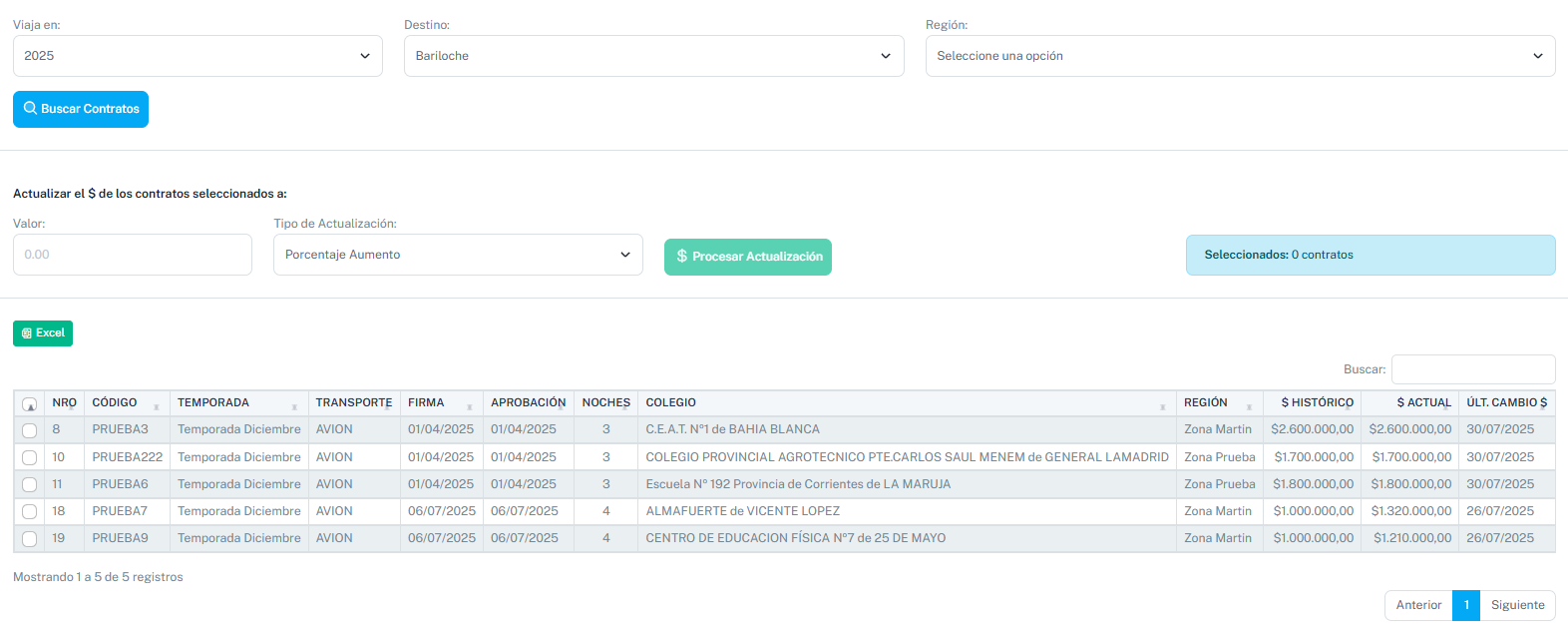 Dentro de la actualización masiva de precios, podremos incrementar el valor de los contratos seleccionando varios cuyo incremento podrá ser porcentual o con un precio en concreto.
