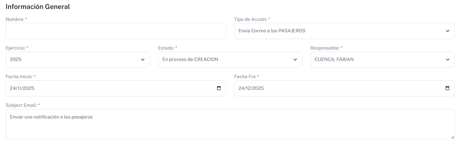 En este módulo, es donde se harán las campañas masivas de información tanto para pasajeros como para los tutores. Esto es algo que se configura para enviar a todo un año en una sola acción (envío de un mail), teniendo en cuenta que su configuración es en HTML.