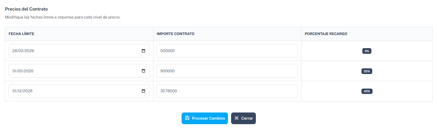 Dentro de la Búsqueda de Contrato, seleccionamos el contrato a cambiar y nos vamos al botón Cambiar Precios
