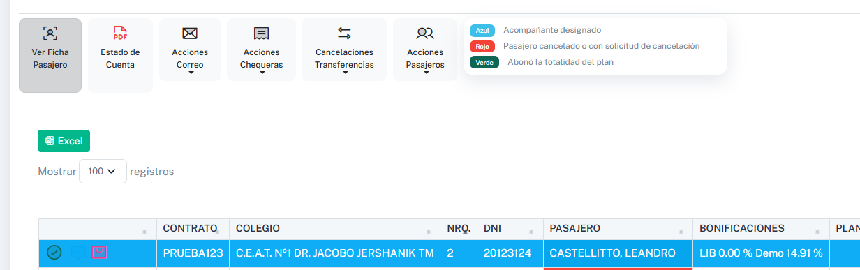 Desde la Ficha del Pasajero, podremos visualizar la información personal, plan de pago, historial y comunicaciones hechas