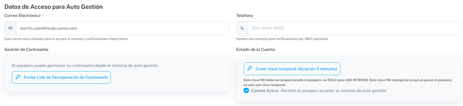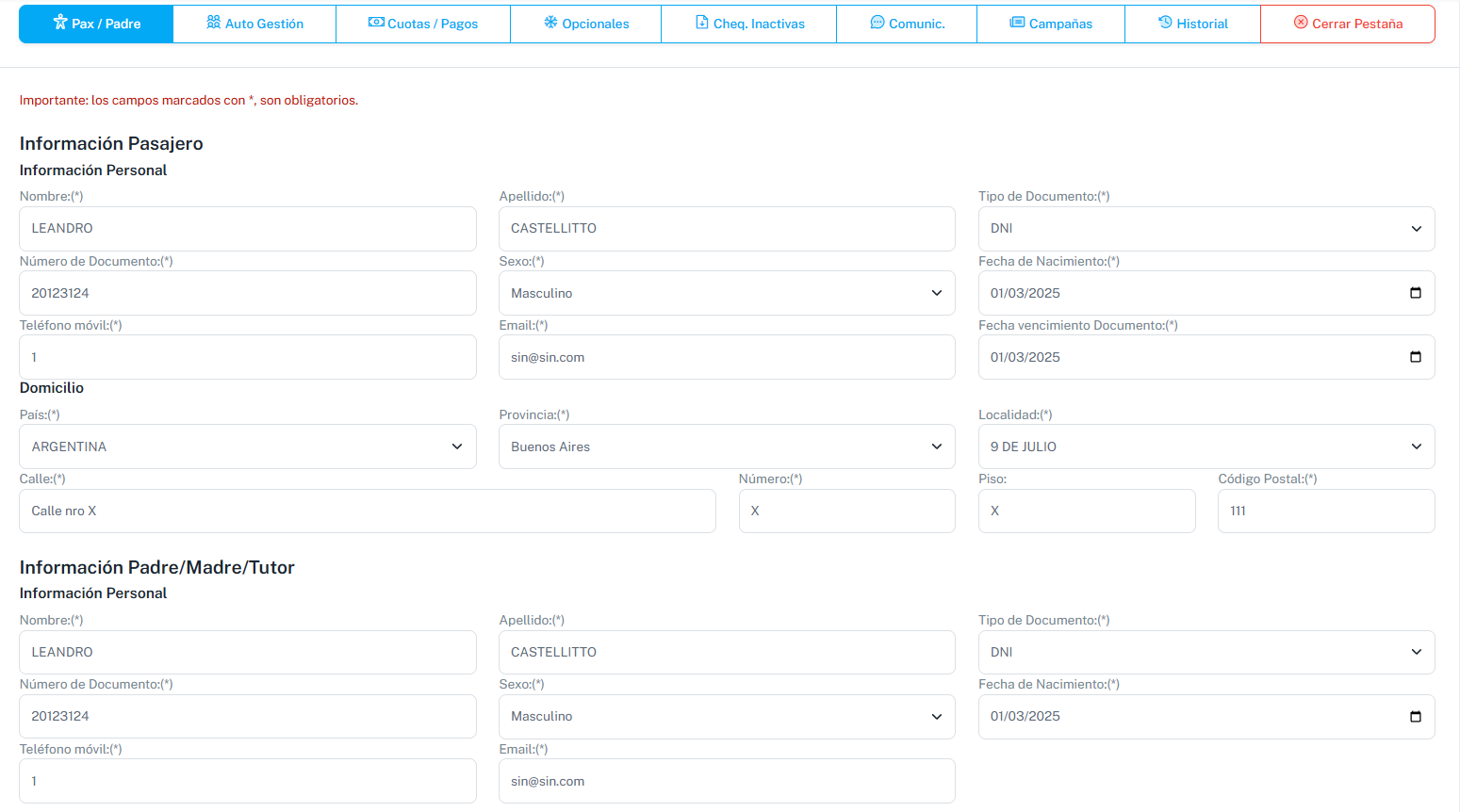 En la pestaña de Pasajero y Padre/s se encontrará la información básica con la que cargó al momento de realizar la autogestión.