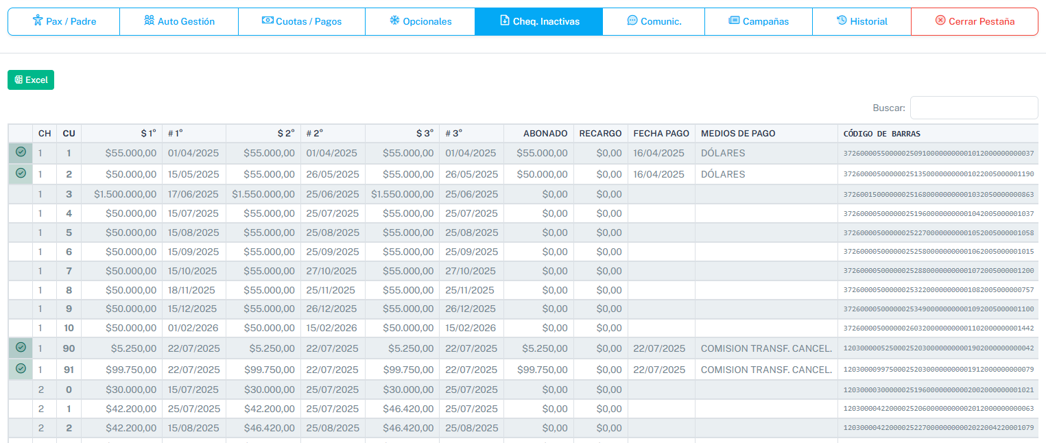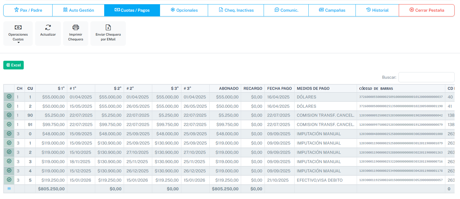 La pestaña de Cuotas/Pagos especifica el plan de pago que eligió el pasajero con sus respectivas cuotas discriminando así la bonificación, seña y cuota cero (opcional que figure, esto se configura desde el contrato), junto con sus fechas de vencimientos, recargos, fechas que realizó el pago, medio de pago por el que se efectuó el pago