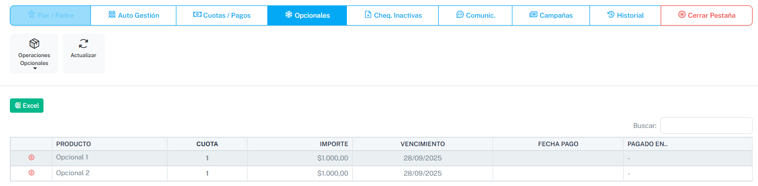 En Opcionales figurarán los opcionales vendidos a este pasajero.