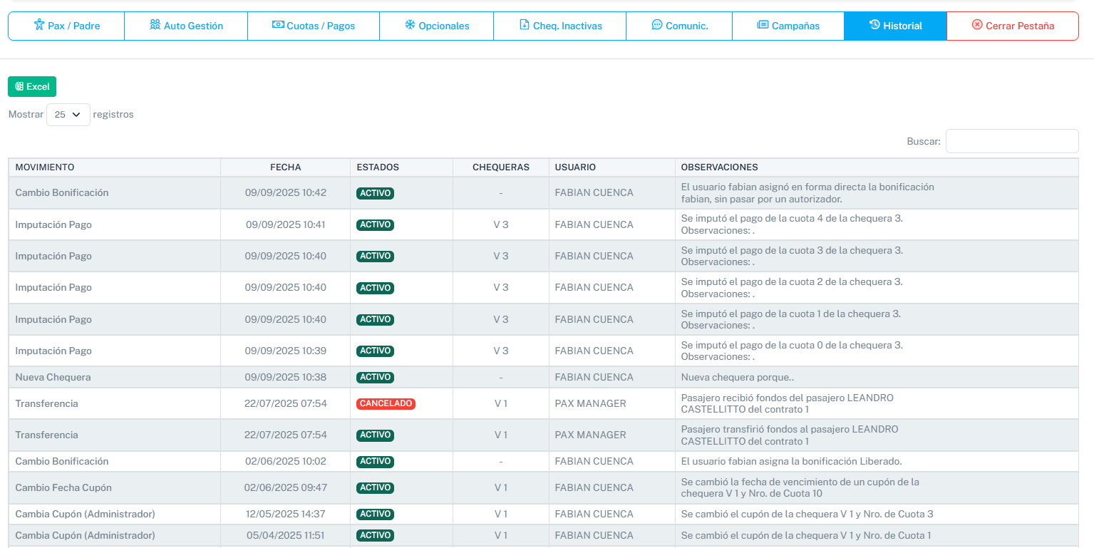 En el Historial mostrará un detalle de todas las acciones y modificaciones que se generaron dentro del pasajero, como el alta, aprobación de pasajero, generación de chequera, envío de chequera, cambio de precio en una cuota, etc.