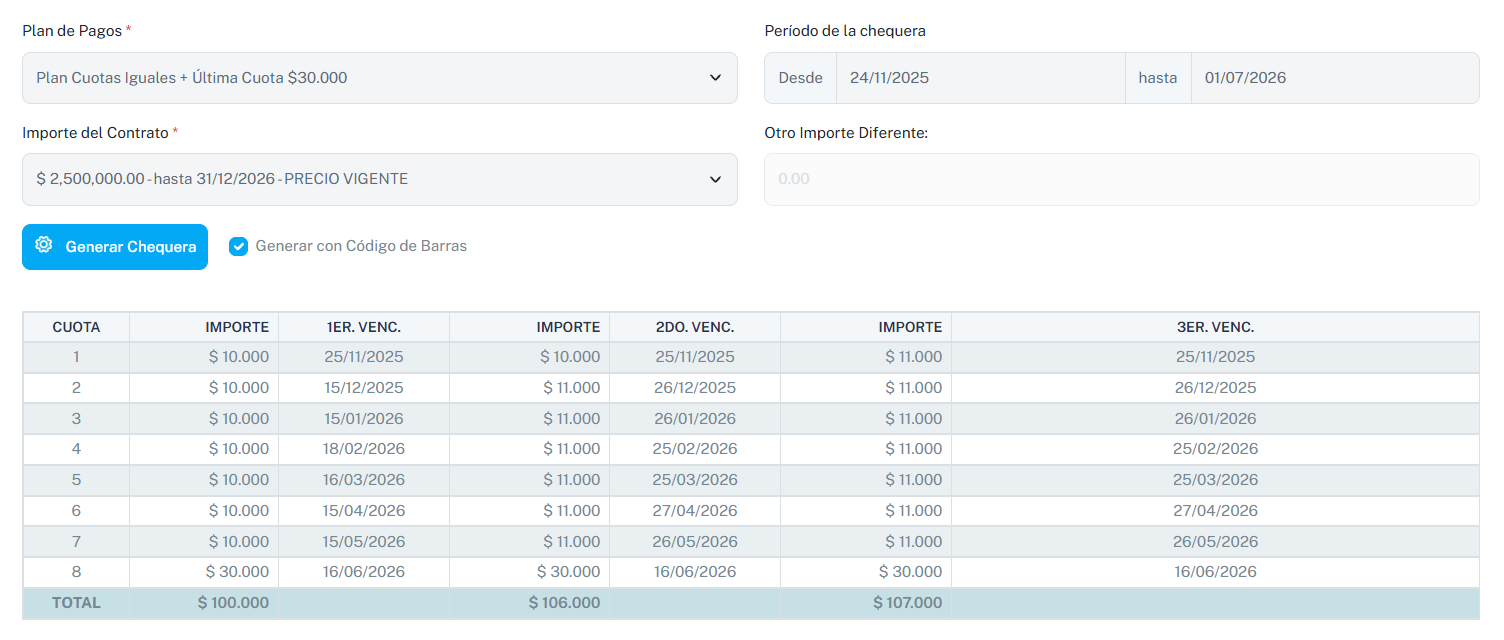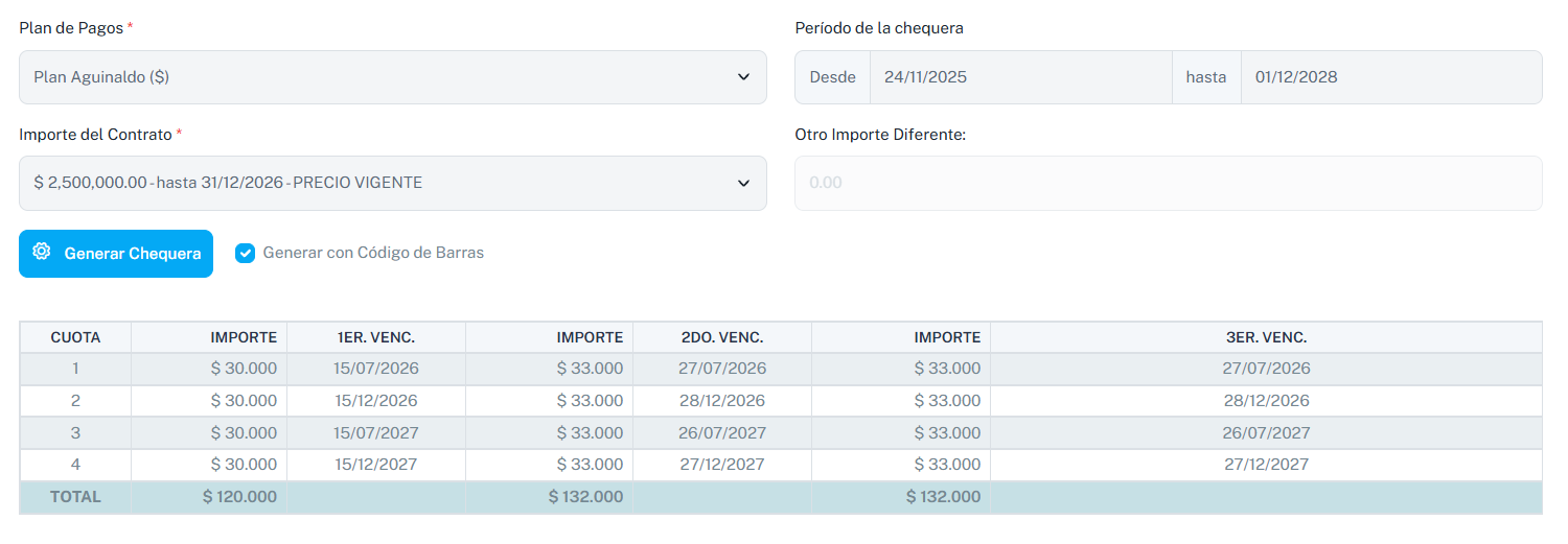 - En caso de especificar el año en las cuotas, debe hacerse si o si con los meses, de lo contrario ocurrirá un error al intentar generar la chequera